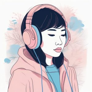 A healing Hand drawn illustration of a Japanese girl holding a bouquet of pink and blue flowers. The image uses minimalist line art, with pastel colors of pink and blue. The style is warm colors and whimsical storybook style. The image features colored pencil and crayon style strokes, rendered on textured paper, with soft edges.