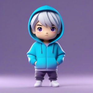AI art prompt English – Cyberpunk Chibi Blind Box Boy: Silver Hair and Mechanical Puppy 3D Render