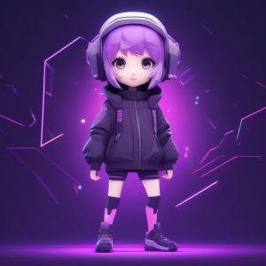 一个可爱时尚的Q版动漫人物,全身站立,装扮成一位赛博朋克未来战士,表情酷飒,动作专业。角色拥有丰富的细节,如发光的耳机和机械臂。采用高细节的8K 3D渲染,使用Octane渲染引擎和C4D建模。强调光线追踪,实现高反光的金属和霓虹光影效果。背景为纯色,干净简洁,凸显角色的黏土材质和柔和的工作室照明,色彩采用充满活力的柔和色彩。