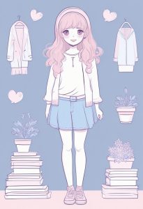 A full body standing Q-version girl with an innocent playful expression, wearing pink and blue fashionable attire. The style is cute doodle, featuring soft rounded lines. The image has a charming aesthetic and minimal details. The colors are a pastel color palette of gentle shades of pink lavender and baby blue. The atmosphere of this simple doodle is lighthearted.
