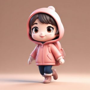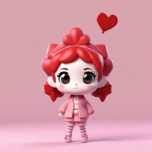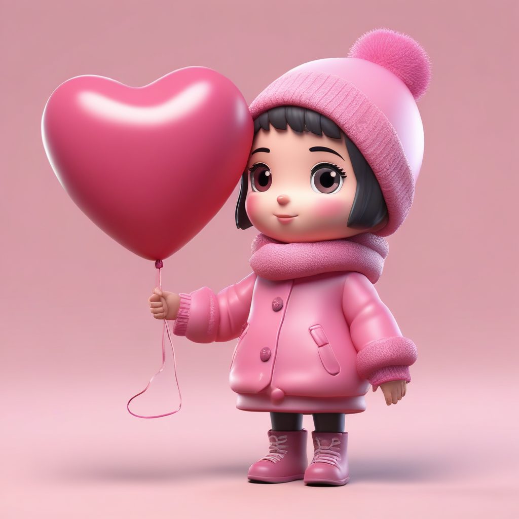 一个可爱的Q版人物,全身站立,穿着粉色系的冬季大衣和围巾,双手抱着一个大大的心形气球,表情极度甜美且动作温柔。采用大头小身体的可爱盲盒比例和光滑的黏土材质设计。这是一个高保真的3D渲染,通过C4D和Octane渲染器实现,利用光线追踪技术和柔和的工作室照明。背景是干净、简单的纯色(浅粉色),完全空白,使用饱和度高的粉彩色调,8K高细节渲染。
