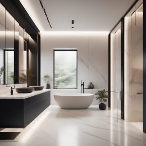 AI art prompt English – Minimalist Luxury Bathroom: Marble and Freestanding Tub