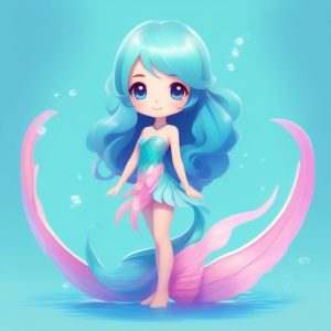 AI绘画提示词中文 – 深海发光鱼Q版女孩:高对比度生物荧光数字绘画,深靛蓝纯色背景