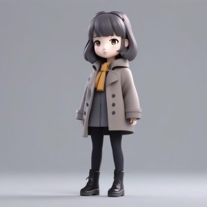 一个简单的主体,一个极简动漫角色卡哇伊Q版人物, 可爱, 全身站立照, 单人, 高细节, 8k, 光线追踪, 马卡龙色, 柔和工作室布光。一个Q版女孩,穿着深色学院风格服饰(高领毛衣,花呢夹克),一只手叉腰,表情若有所思。干净、简单、纯深青色(柔和)背景。