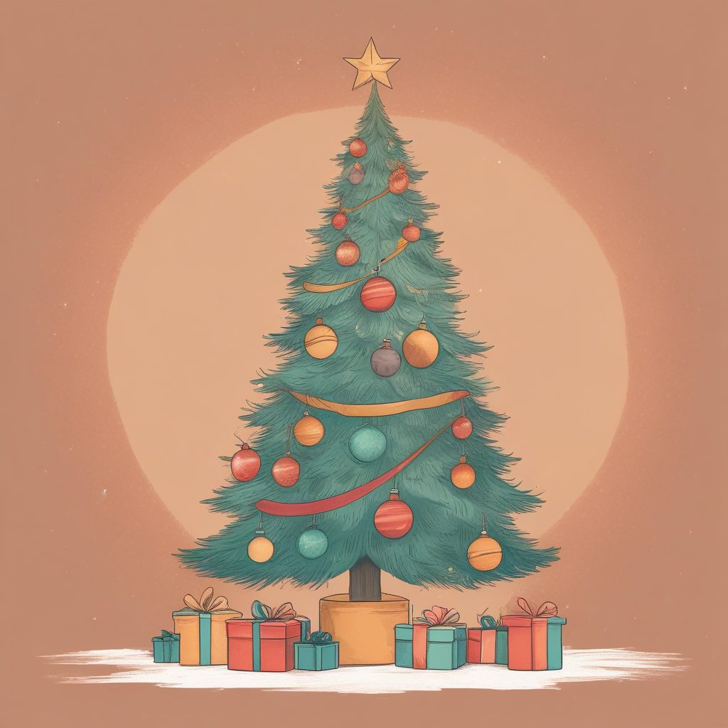 A minimalist line illustration of a Christmas tree with cozy holiday decorations. Hand drawn colored pencil style, utilizing warm colors and soft pastel colors. The image has a textured paper effect, soft edges, and a whimsical storybook illustration.