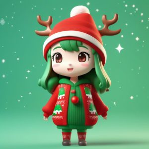AI绘画提示词(中文) – 圣诞树装饰师:高细节Q版女孩3D手办模型,绿色调柔和色彩提示词