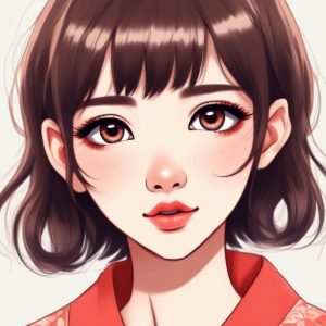 A cute fashionable Japanese girl portrait, minimalist hand drawn line art illustration. Makeup includes rouge, under eye blush, and glossy lips. Utilizes warm colors and pastel colors, with a crayon style aesthetic. Overall whimsical quality, soft edges, solid color background, emphasizing paper texture.