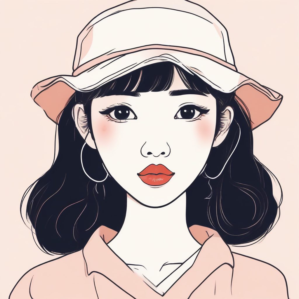 一个可爱时尚的日系少女头像,极简手绘线稿插画。妆容包括腮红、卧蚕(under eye blush)和光泽嘴唇。画面采用温暖色彩(warm colors)和粉彩色调,具有蜡笔风格。整体具有异想天开的(whimsical)特质,柔和边缘,纯色背景,强调纸张肌理。