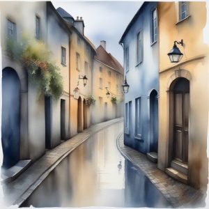一张日式街景的手绘插画 (权重1.3),描绘雨后的东京街角。画面采用故事书般的风格,具有柔和的边缘和温暖的粉彩色调。强彩色铅笔 (权重1.2) 和蜡笔风格 (权重1.1) 的笔触感。重点展现潮湿的有纹理的纸张效果。画面细节充满异想天开的怀旧氛围。