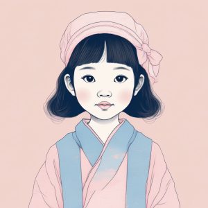 A granulated Japanese girl minimalist line art `illustration`, dressed in a small pink and blue dress. Emphasis on the `Hand drawn` style, utilizing the fine strokes of `colored pencil` and `crayon style`, along with clear `textured paper`. The overall colors are inviting `warm colors` and `pastel colors`, with `soft edges`, possessing the `whimsical` charm of a `storybook style` illustration. Clean pale background.