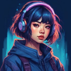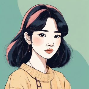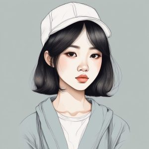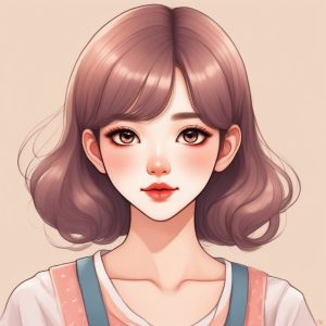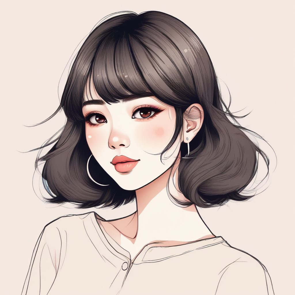 Cute Japanese girl anime portrait, hand drawn line art illustration style. Emphasizing refined fashionable makeup, including heavy rouge, under eye blush, and glossy lips. Utilizes crayon and colored pencil techniques, soft edges, and displays warm colors and pastel colors. Features a whimsical storybook style, with visible textured paper. Solid color background.