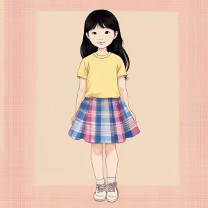 A whimsical portrait of a Japanese girl with cute twintails and a plaid mini skirt. The illustration adopts a storybook style, featuring a warm color palette and soft edges. It presents a hand drawn aesthetic, achieved using detailed colored pencil and visible crayon style marks on textured paper. Bright pastel colors dominate the scene, set against a solid soft baby blue background.