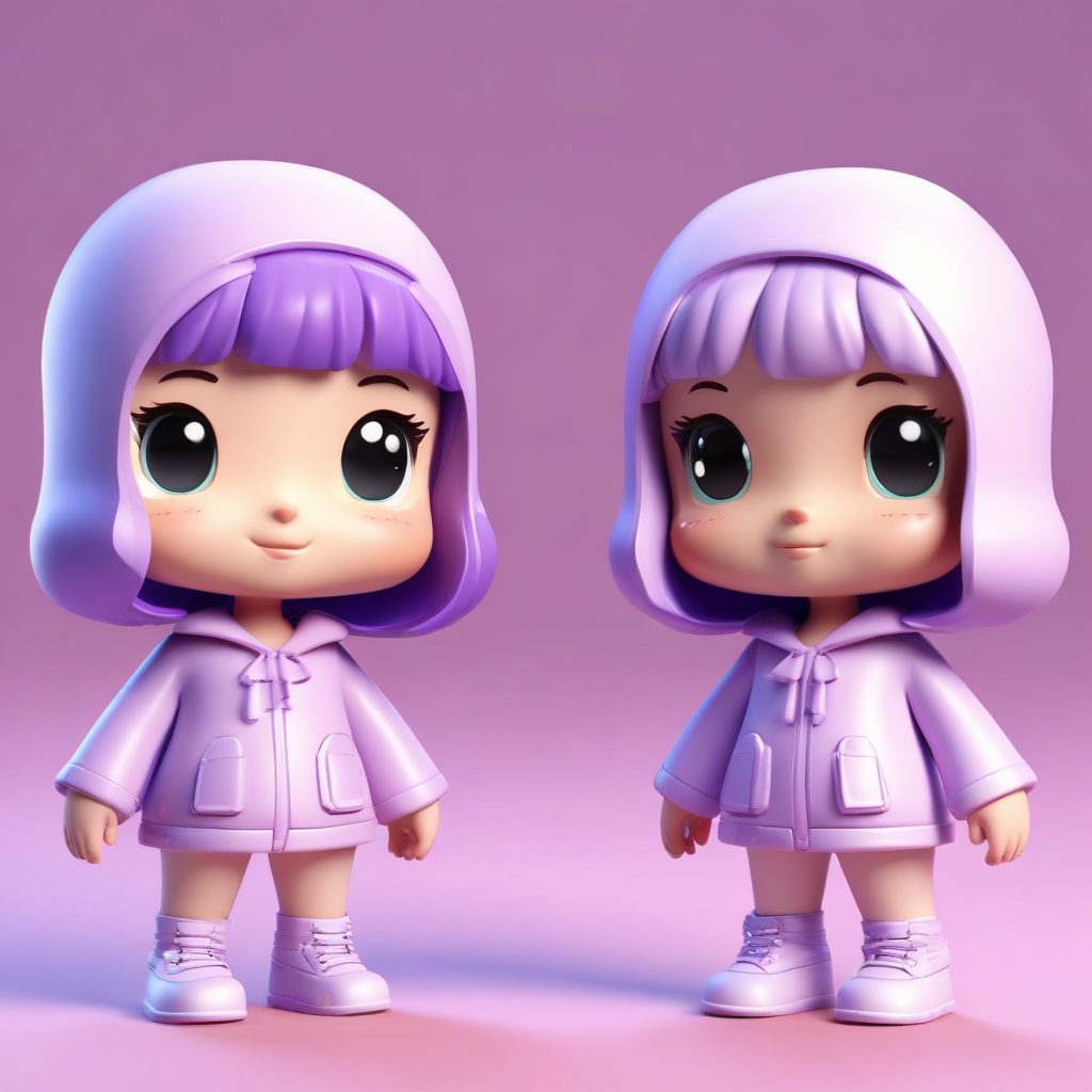 两个全身站立的可爱Q版双子座角色,头大身小,展现 Pop Mart 盲盒手办的美学。这两个角色使用光滑的黏土材质,采取镜像的动态姿势,彼此牵着手。这是一个高保真的3D渲染,由C4D和Octane渲染器实现,强调光线追踪和柔和工作室照明。色彩采用明快的柔和色彩,高细节8K渲染。背景是干净、简单的纯淡紫色,无任何图案或纹理。