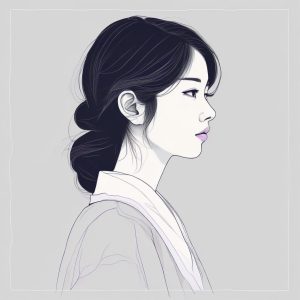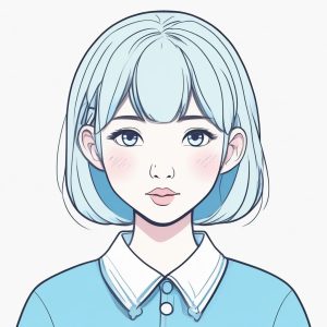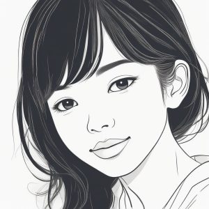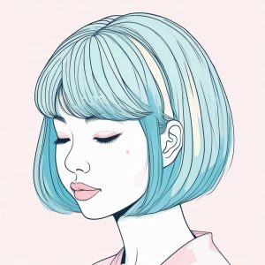 A minimalist line art illustration of a Japanese girl’s head with sleepy, half-closed eyes, executed in a simple doodle style, utilizing soft rounded lines. The image features minimal details, conveying a lighthearted, relaxed expression. It uses warm latte and gentle shades of baby blue pastel palette. The background is a solid warm beige, projecting a charming, cozy aesthetic.