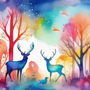AI art prompt English:watercolor abstract forest, rainbow colors blending, dreamy atmosphere, soft blurred edges, overlapping trees, magical fantasy, whimsical style, vibrant background, storybook illustration