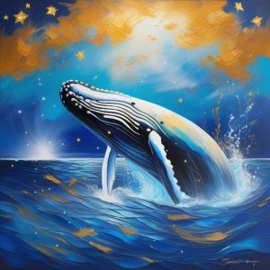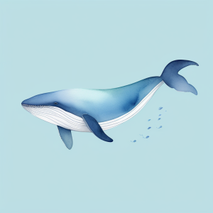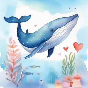 一幅超现实水彩插画,一条蓝鲸温柔地漂浮在深靛蓝色的夜空,银白亮星闪烁,梦幻波浪下涌,柔和的粉彩云朵,魔法般的氛围,精美水彩纹理,日本风宁静细语。