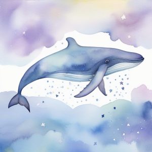 A large surreal watercolor illustration of a blue whale floating gently across a deep indigo night sky, twinkling silver stars, dreamy waves below, soft pastel clouds, magical atmosphere, beautiful watercolor textures, whisper of tranquility Japanese style.
