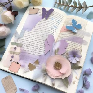 Whimsical journal page illustration in watercolor, depicting a magical forest scene with oversized mushrooms, sparkling dew, and hidden woodland creatures. The page layout is collage-like with soft color splashes, uneven paper textures, and delicate hand-drawn floral borders.