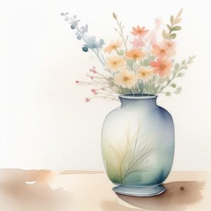 Soft watercolor minimalism of a single flower in a small glass vase, subtle hints of color, large white background, gentle shadows, focus on delicate petal textures, tranquil and airy composition, peaceful mood.