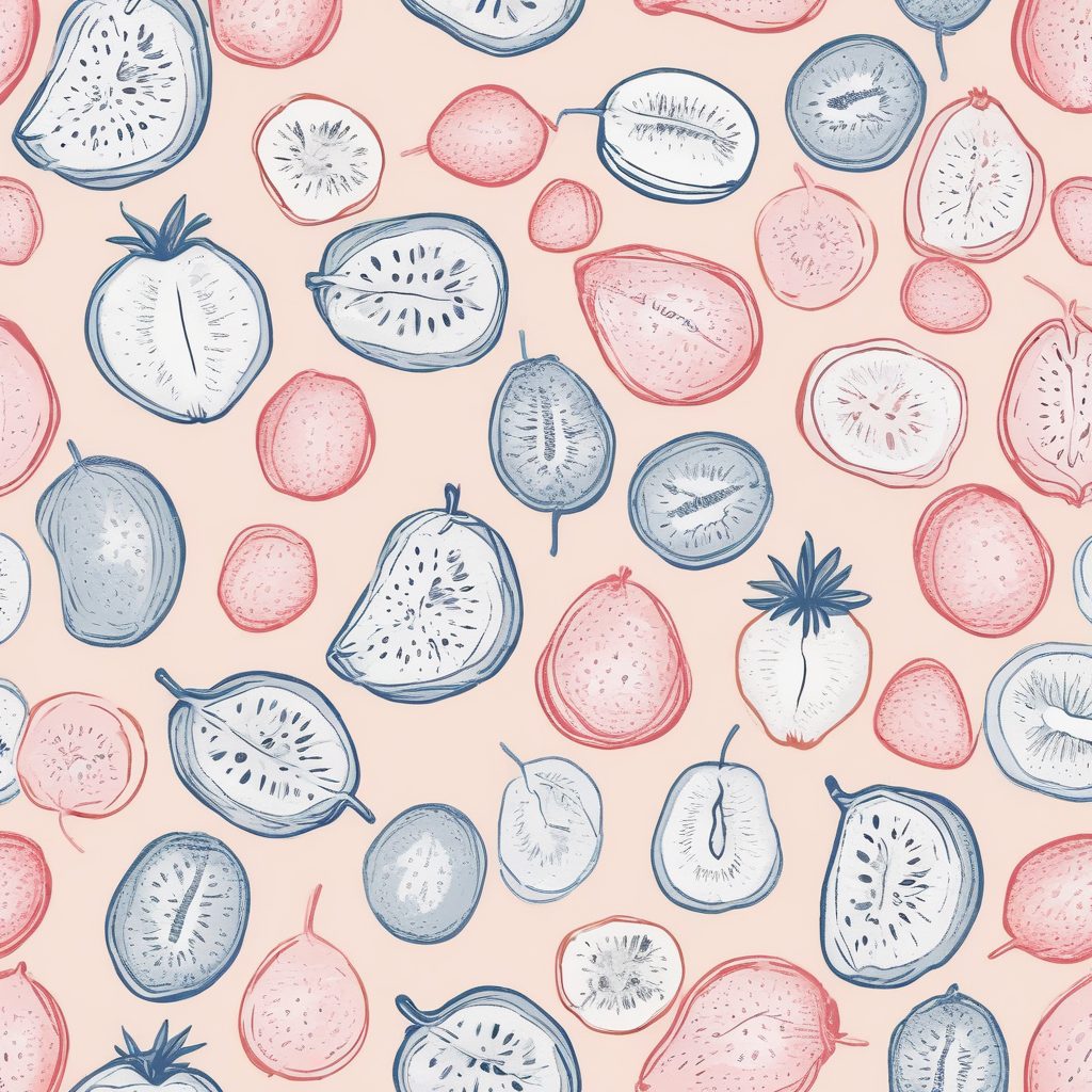 A repeating minimalist line art fruit pattern illustration, such as kiwis and strawberries. Rendered in a strong crayon style, featuring coarse hand drawn lines and visible paper texture. Utilizes bright pastel colors and warm colors, with soft edges, conveying a whimsical style.