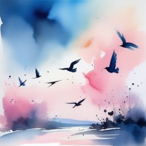 AI art prompt English:Expressive sumi-e ink painting of a flock of birds soaring over misty mountains, dynamic brushwork, tranquil atmosphere, powerful ink flow aesthetics