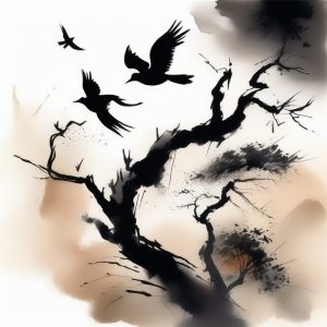 AI绘画提示词中文:水墨山水之间,一群鸟儿展翅高飞,动感的笔触和流动的墨色营造出宁静又充满力量的画面。