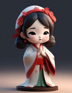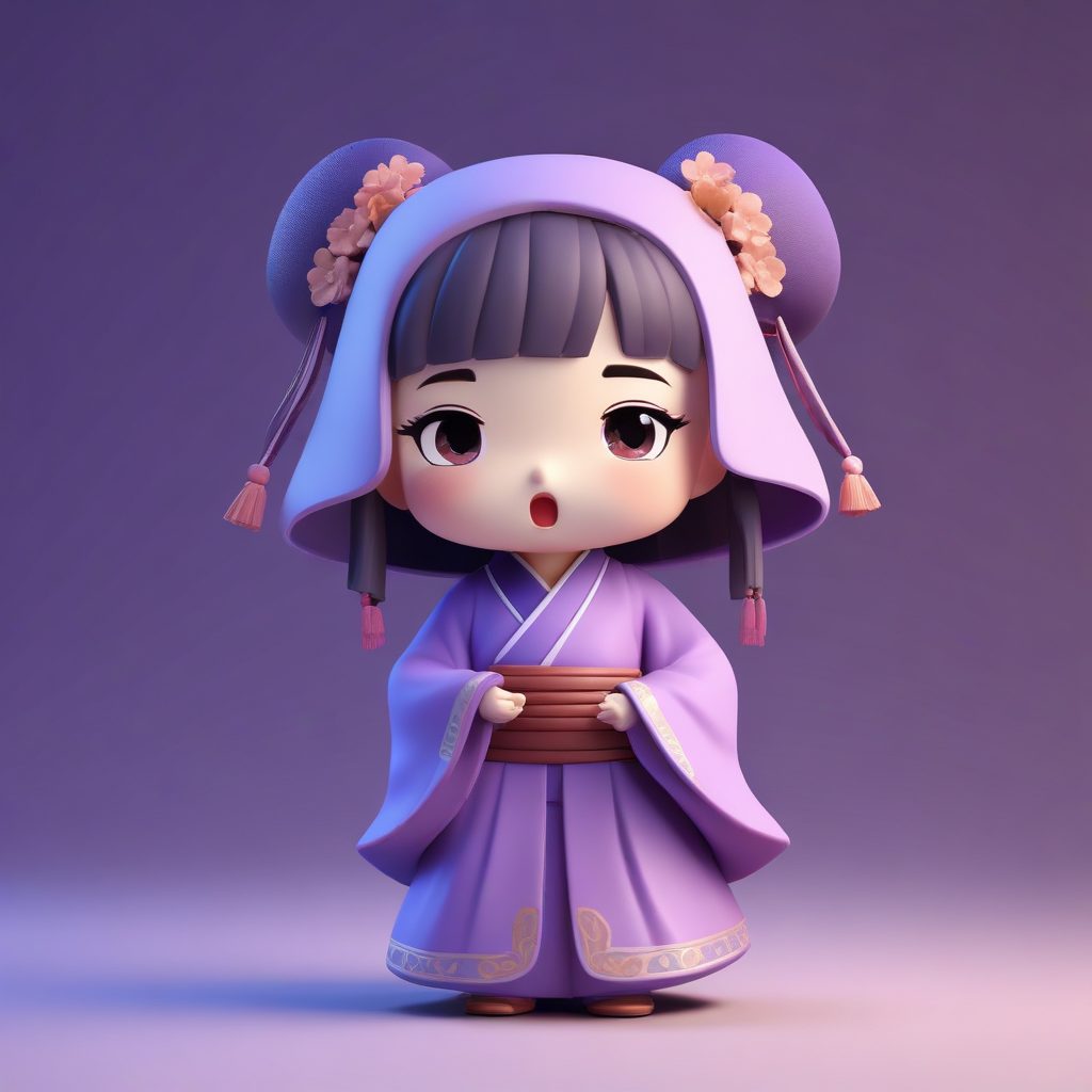 一个全身站立的可爱Q版汉服小女孩,正在打哈欠,表情是困倦而迷糊。这是盲盒设计手办,具有完美的大头小身比例和光滑的黏土材质。使用C4D和Octane渲染,实现超高细节3D渲染。光线追踪和柔和的工作室照明突显安静的淡紫色系。背景是纯淡紫色,干净,完全空旷,8K高清。