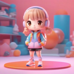 生成运动系女学生的3D盲盒手办渲染图。女孩身穿亮眼运动服,手持迷你奖杯,渲染强调动态站姿和高饱和度的柔和色彩,突出C4D建模的立体感。