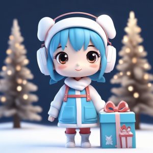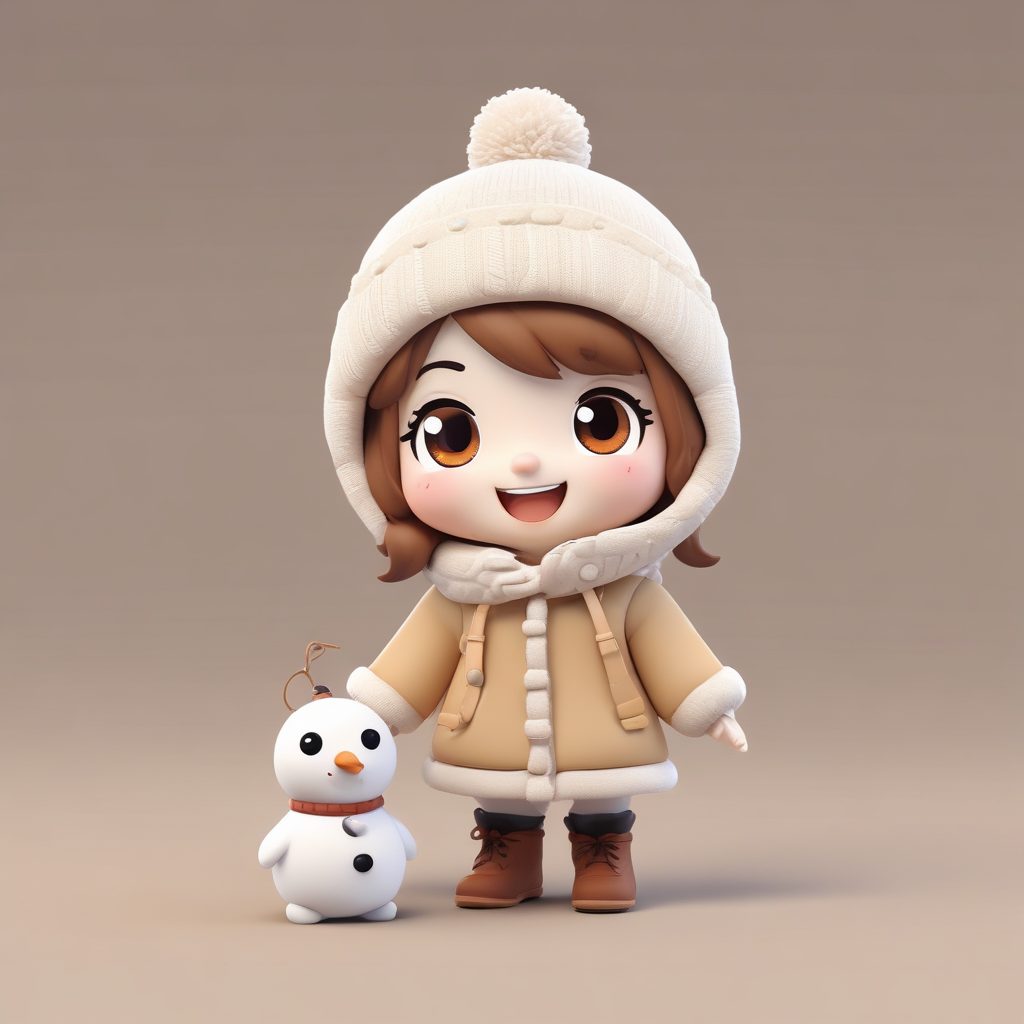 一个极简可爱的Q版女孩,全身站立,穿着冬日时尚装扮,手里抱着一个小雪人配件。她开怀大笑,动作极具感染力。角色采用Pop Mart盲盒美学,突出大头小身体比例和可爱的黏土材质。这是一个通过C4D和Octane渲染器实现的高清3D渲染,配有柔和的工作室照明。背景是纯色的柔和米色,干净、简单,完全空白,无任何图案,8K高细节渲染。