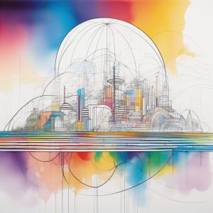 创作关于未来漂浮模块化住宅的AI提示词。画面通过极简线条、黑色墨水和抽象几何体勾勒出悬浮结构,彩虹水彩表达反重力推进的轨迹,突出轻盈和动态感。