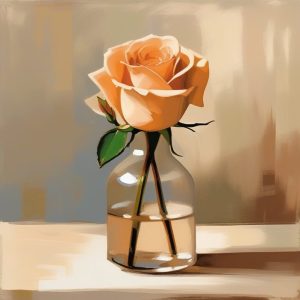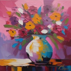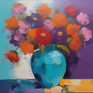 A painted atmospheric warm impressionist abstract of a vase filled with wildflowers, vivid reds, yellows, and oranges blending with soft, swirling brushstrokes, flowers loosely defined with blurred contours, reflections dancing on a wooden table, warm sunlight streaming from the side, colorful splashes merging background and foreground, an expressive, dynamic and joyful composition.