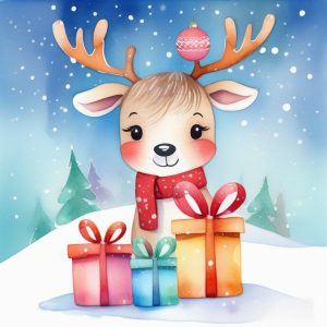 Christmas watercolor clipart for kids showing cute animals in Santa hats, soft snowy scenes, childlike gentle brush strokes, pastel reds and greens, subtle sparkles, festive Christmas watercolor clipart for kids.