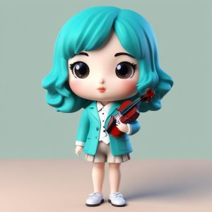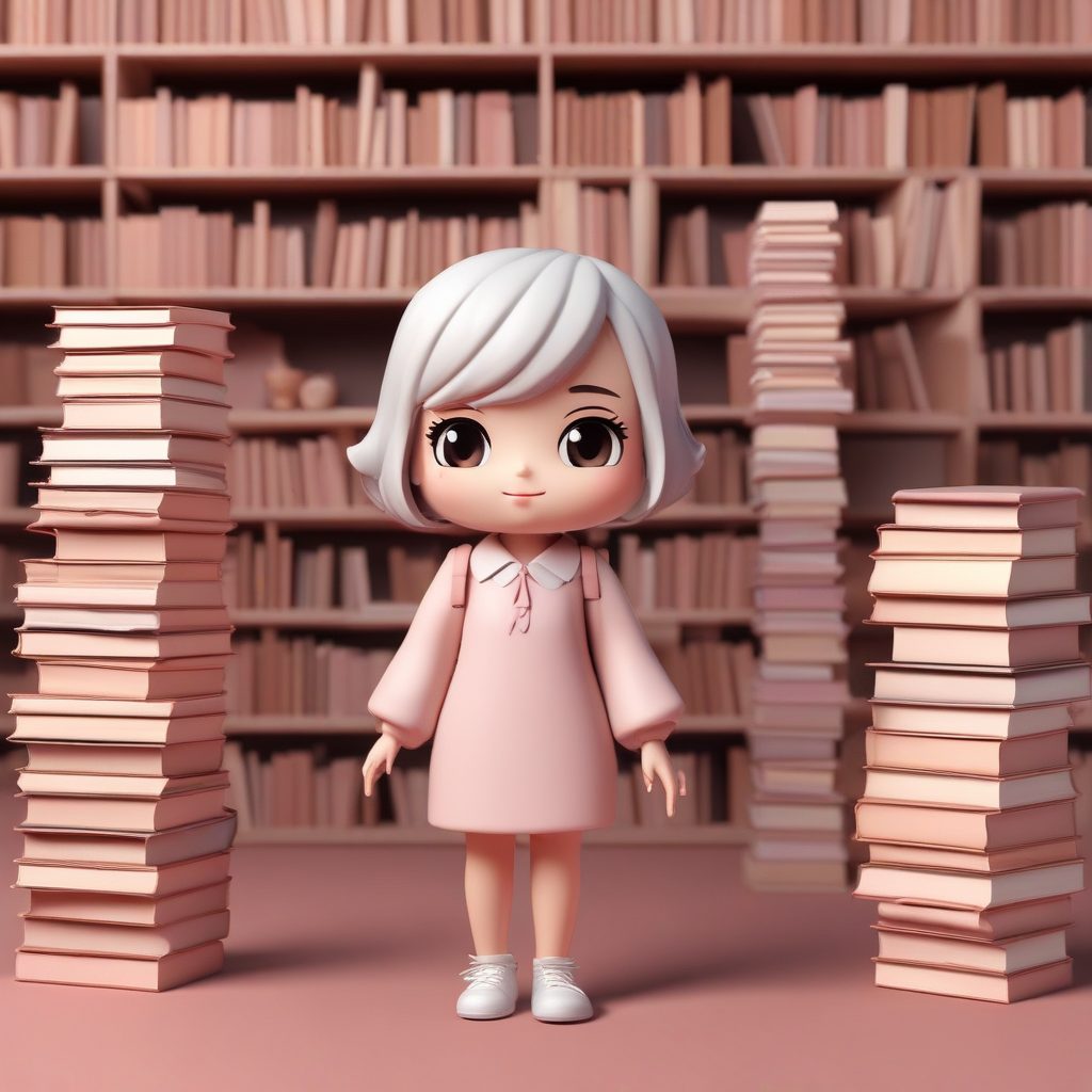 一个全身站立的Q版文学教师,具有chibi大头小身体比例。她被几堆微型的、优雅堆叠的书籍围绕。以Pop Mart盲盒的黏土材质美学风格呈现。这是一个高细节8K 3D渲染,通过C4D和光线追踪技术实现。采用柔和的工作室照明,突显柔和的玫瑰粉色和金色调。背景是干净、简单的纯象牙白,完全空白。