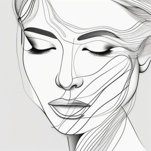 文艺极简线条艺术女性,低头沉思单线条勾勒,纯白背景,极简抽象优雅,细腻细节艺术。