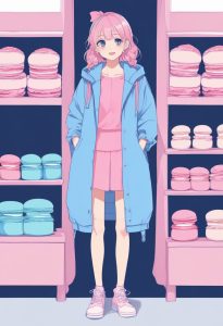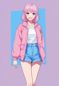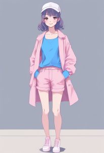 Solo, fashionable girl in a pink and blue outfit, smiling, full body standing photo. Anime minimalist style, using a macaron color palette and low saturation. Defined Cel shading style. Background: solid color, clean, simple, completely empty, no patterns, no details.