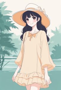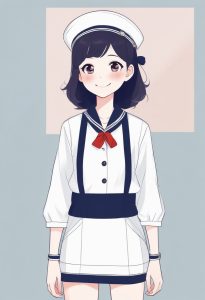 全身站立的极简动漫插画,主角是一位微笑的时尚女孩,穿着简约上衣,并搭配了一条有特色的围巾作为配饰。画面风格为厚粗线条轮廓,纯平面颜色填充,并有柔和的赛璐珞阴影。配色使用低饱和度的马卡龙色系。背景要求是纯色,干净,完全空旷。