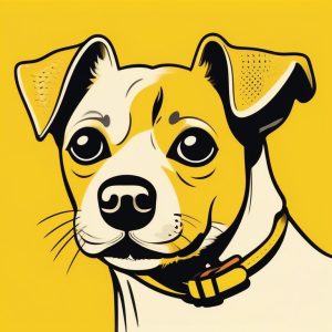 A silhouette of a single small running dog, in a playful pose, rendered in flat black on a solid pale yellow background. No facial or fur detail, emphasizing movement and joy in a minimal form.