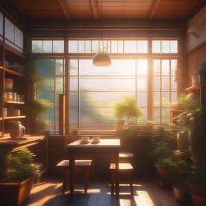灵感来源于《你的名字》的田园场景。在新海诚的视觉风格下,描绘金色稻田旁的小径,彗星划过天空,强调柔和而充满活力的金色调。