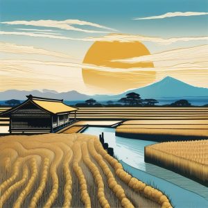 AI绘画提示词中文 – 乡村邂逅:金色稻田上的光影交错与彗星轨迹
