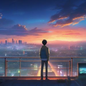 AI art prompt English:Makoto Shinkai Style Key Visual of Future City Bullet Train at Sunset