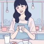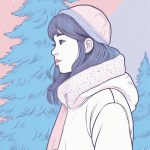 A simple doodle close-up illustration of a cute Japanese girl, focusing on her innocent playful expression and large eyes. The artwork is lighthearted, focusing on minimal details and soft rounded lines. The pastel color palette, especially gentle shades of pink lavender and baby blue, contributes to a charming aesthetic.