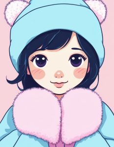 A simple doodle close-up illustration of a cute Japanese girl, focusing on her innocent playful expression and large eyes. The artwork is lighthearted, focusing on minimal details and soft rounded lines. The pastel color palette, especially gentle shades of pink lavender and baby blue, contributes to a charming aesthetic.