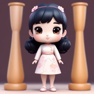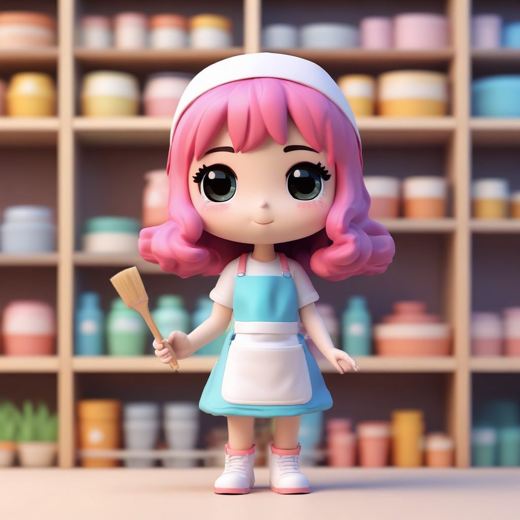 一个全身站立的Q版艺术教师,具有大头小身体的chibi比例。她穿着可爱的围裙,手持调色盘和一把微小的画笔。以盲盒手办的黏土材质美学风格呈现。这是一个通过C4D和Octane渲染实现的8K高细节3D渲染。画面使用光线追踪和柔和的工作室照明,强调充满活力的彩虹柔和色彩。背景是干净、简单的纯白色,完全空白,没有纹理。