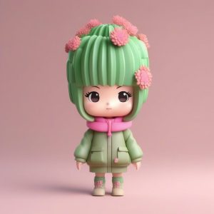 Minimalist anime character kawaii chibi 1 girl, full body shot, solo, wearing green dinosaur pajamas with a hood, sitting down sleeping peacefully, Pop Mart style, blind box toy, clay material, matte finish, soft greens and pastel yellow accents, 3d render, C4D, Octane render, studio lighting, high quality, 8k, Solid Color background, Clean, Simple.