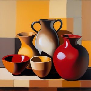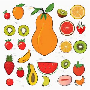 抽象静物画,由各色水果组合摆放在复古木桌上。印象派油画风格,充满活力的可见笔触和大胆的色块。橙子、苹果和葡萄用夸张色彩表现。背景色彩旋涡状融合,突显每个水果的质感和形态。