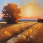 Impressionist oil painting of countryside landscape, vibrant brushstrokes, golden wheat fields, colorful wildflowers, warm sunlight, rustic cottages, gentle rolling hills, textured impasto