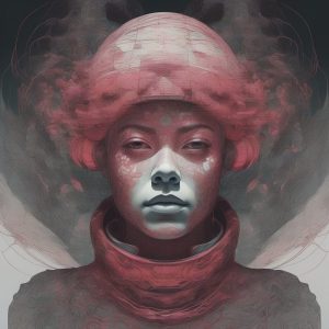A cute chibi boy, full body, standing pose, high intensity portrait. Solid color background, imbued with surreal art aesthetics. Algeapunk style, focusing on organic marine textures overlaying details. Elegant inking and fine expressive lines defining the figure. Light gray and light crimson colors dominant. Clear datamosh and glitchy effects near the edges. Heavy mist layer, very dreamlike.