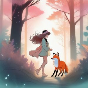 酷炫动漫漫画T恤设计,描绘一位披黑斗篷的剑士在迷雾森林中与神秘的白鹿邂逅。场景被穿越密林的淡淡光束照亮,地面有苔藓石块和盘绕树根增加纹理感。画风线条清晰,色彩以深绿和大地色为主,氛围神秘且梦幻。