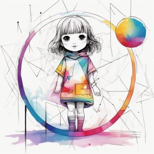 生成以水彩流动感为核心的AI提示词。描绘穿着雨衣的Q版女孩,伞边滴落着彩虹水彩,强调黑色墨水轮廓与背景负空间中的抽象几何形状的对比。