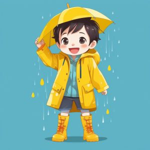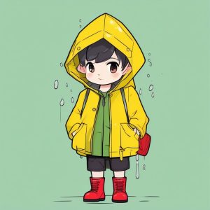 AI art prompt English – Whimsical Chibi Boy in Raincoat with Vertical Watercolor Drips